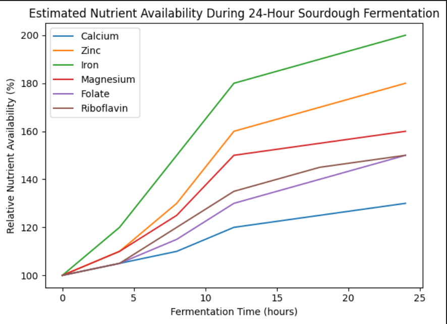 The graph above shows the relative increases in specific nutrients over the fermentation window, and illustrates why long fermentation matters. Sourdough fermentation transforms flour by breaking down the phytic acid (found in nearly all grains), which binds to nutrients, limiting their absorption. The lactic and acetic acid bacteria in sourdough produce acids which degrade phytic acid and unlock nutrients such as: Calcium, Iron, Magnesium, Zinc, Folate, Riboflavin, and even more.